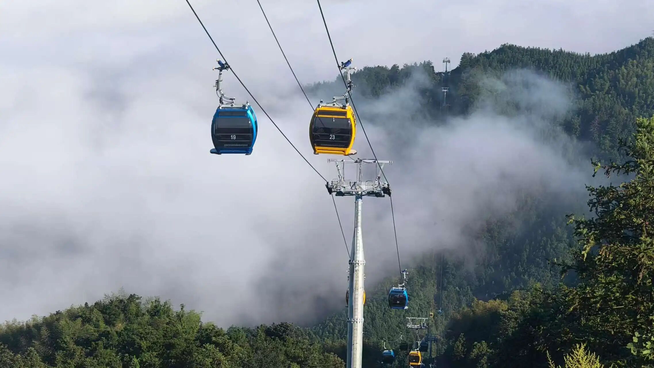 湖南雪峰山索道总水平长7322米,总斜长7567.198米,是中国最长的索道、亚洲最长的高山索道。该索道高差1158.5米,设有中间转角站,夹角为134.696°。全线设立51座支架,配备114个八人吊厢。最高运行速度达每秒6米,单向运量最高每小时1200人。该索道采用AB两段式布局,可实现大小循环运行模式的灵活切换,满足多样化运营需求。